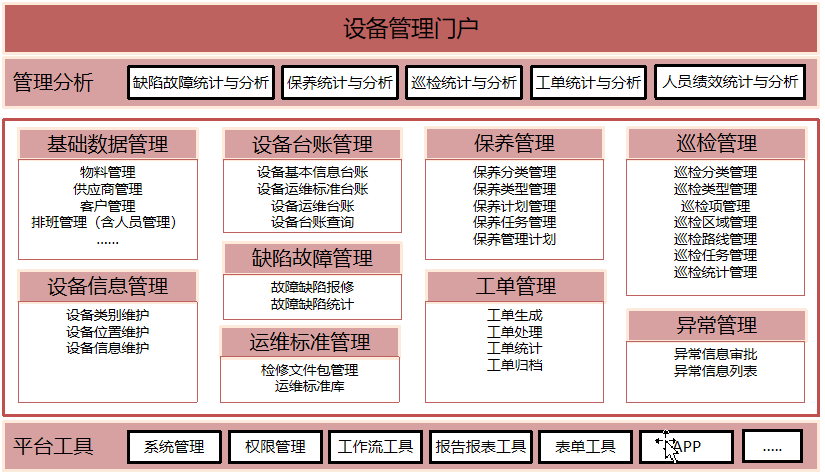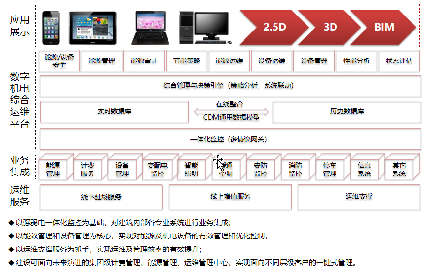 第一层次为子系统设备层的纵向集成,目的在于各子系统具体功能的实现。对于建筑设备管理系统子系统,如电梯系统、给排水供应设备、中央空调控制系统、照明控制等智能化设备需进行部分网关开发工作,其它子系统的纵向集成多以子系统为单位正常工作,从工程管理、技术协调上满足系统集成的需要。 第二层次为监控层的横向集成,主要体现各子系统的联动和优化组合,在确立各子系统重要性的基础上,实现几个关键子系统的协调优化运行,报警联动控制等再生功能。 第三层次为应用层的一体化集成,即在横向集成的基础上,实现中央集成管理系统(BMS),即实现网络集成、功能集成、软件界面集成。智能化集成的最终目的也就是要实现这一层的集成。 另外,结合集成平台提供的智慧运维服务,包括设备管理、运维服务能内容。 由此,智能化系统集成平台与智慧运维平台构成了完整的数字机电智慧运维平台。